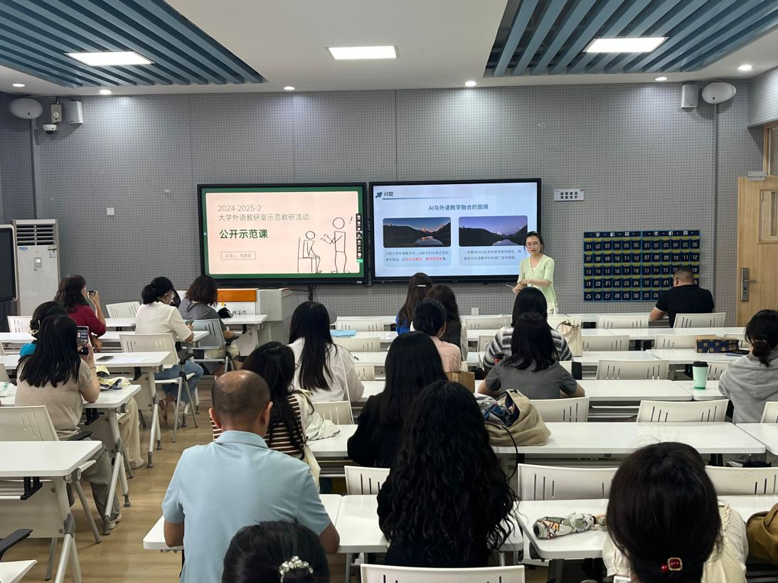 2025年4月23日大学外语教研室全体教师齐聚主教C201教室,共同参与由黄乔伊老师主讲的“智能时代的大学外语课堂:AI辅助教学的创新路径与实践”专题讲座。本次活动聚焦人工智能技术在外语教学中的深度融合与应用,探索新时代背景下语言教育模式的转型与突破。