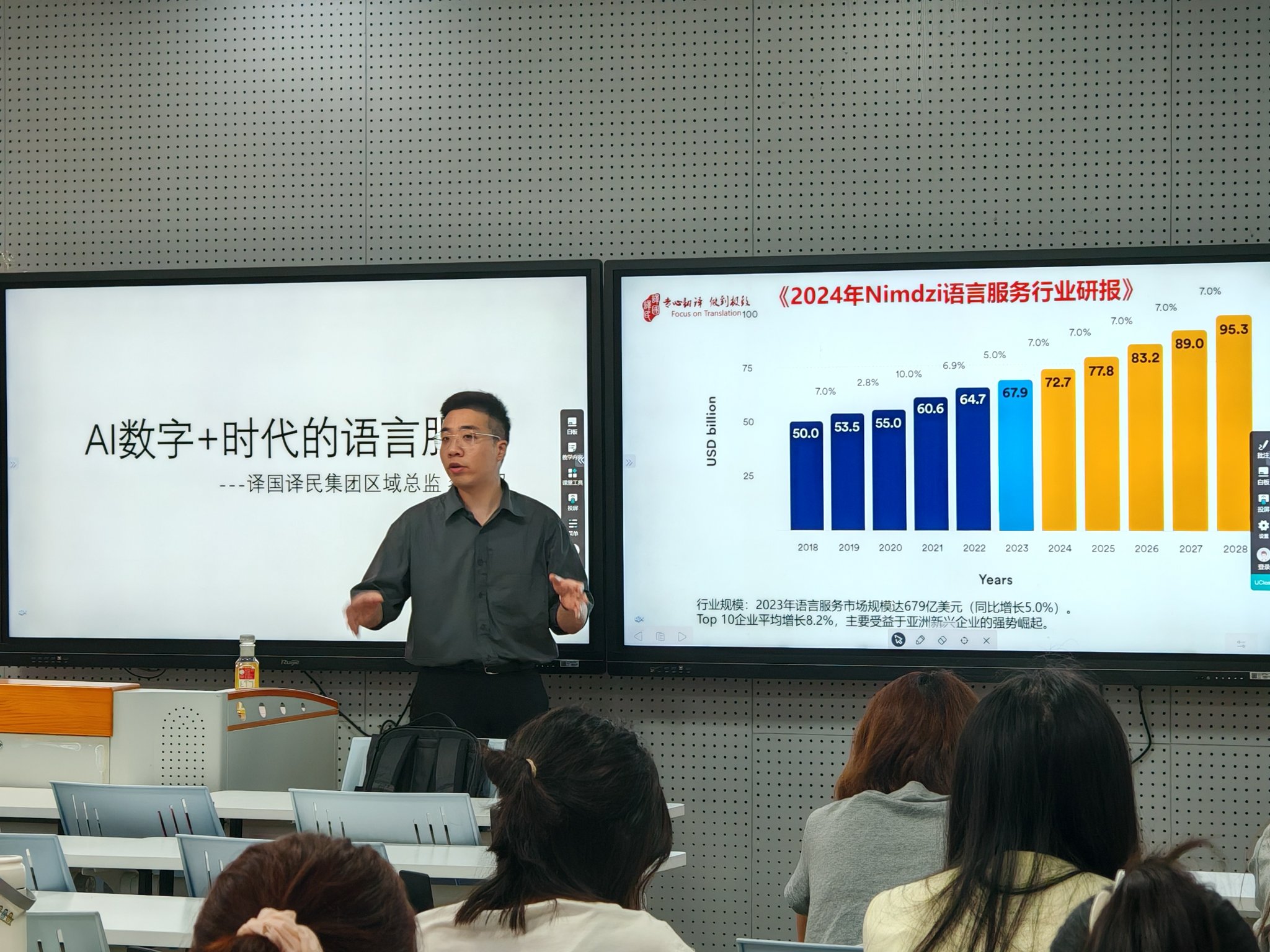 2025年5月14日下午13:30—15:00,mk体育在主教学楼C101教室成功举办了一场主题为“AI数字+时代的语言服务”的专题讲座。本次讲座特邀译国译民教育区域总监蔡舒超先生,为同学们带来了一场前沿与实用并重的语言服务专题分享。mk体育经理助理余霞和英专刘慧玲主任与主讲老师一行进行深入交流,了解最新翻译行业发展情况及英语专业市场需求,探讨AI数字时代下英语人才培养路径。本次讲座由杜振宇副主任主持,英语专业师生代表参加。