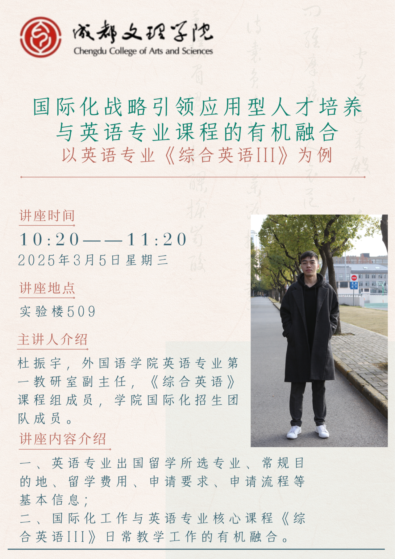 讲座预告:国际化战略引领应用型人才培养与英语专业课程的有机融合——以英语专业《综合英语Ⅲ》为例》