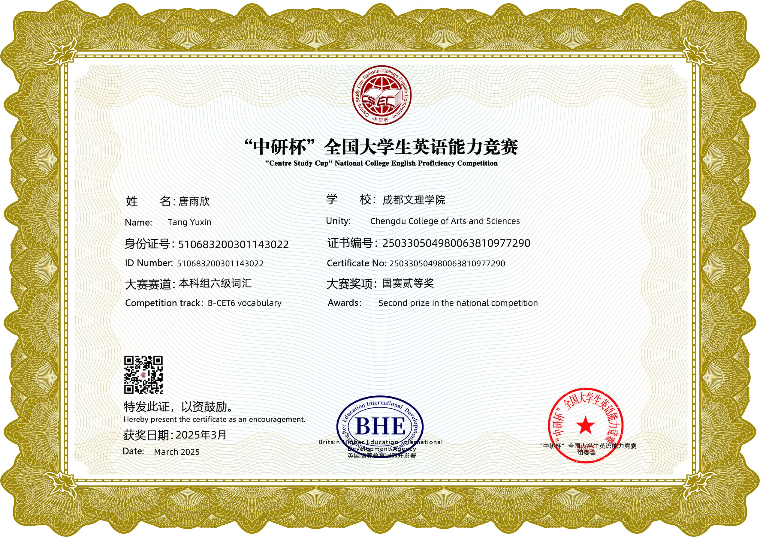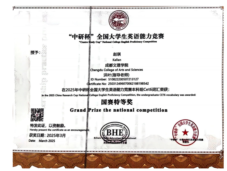 该竞赛由英国高等教育发展与交流协会(BHE)主办,采用网络线上赛制,吸引全国众多高校学子参赛。在mk体育洪叶老师指导下,赵琪同学凭借深厚的词汇储备和卓越的临场发挥,在本科组CET6词汇竞赛中脱颖而出,摘得全国特等奖。