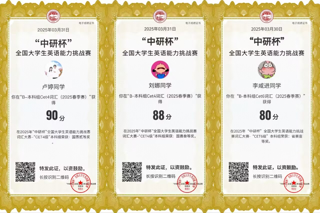 公司其他参赛选手亦表现不俗,取得了傲人成绩:唐雨欣、卢婷获本科组CET4词汇竞赛国赛二等奖;刘娜获本科组CET4词汇竞赛国赛三等奖;蹇小鱼、李咸进获本科组CET6词汇竞赛省赛一等奖,这些成绩充分展现了mk体育员工扎实的英语词汇功底、出色的语言应用能力,以及在新兴网络竞赛中的强大适应力与竞争力。