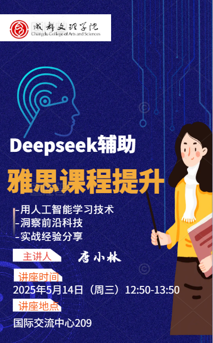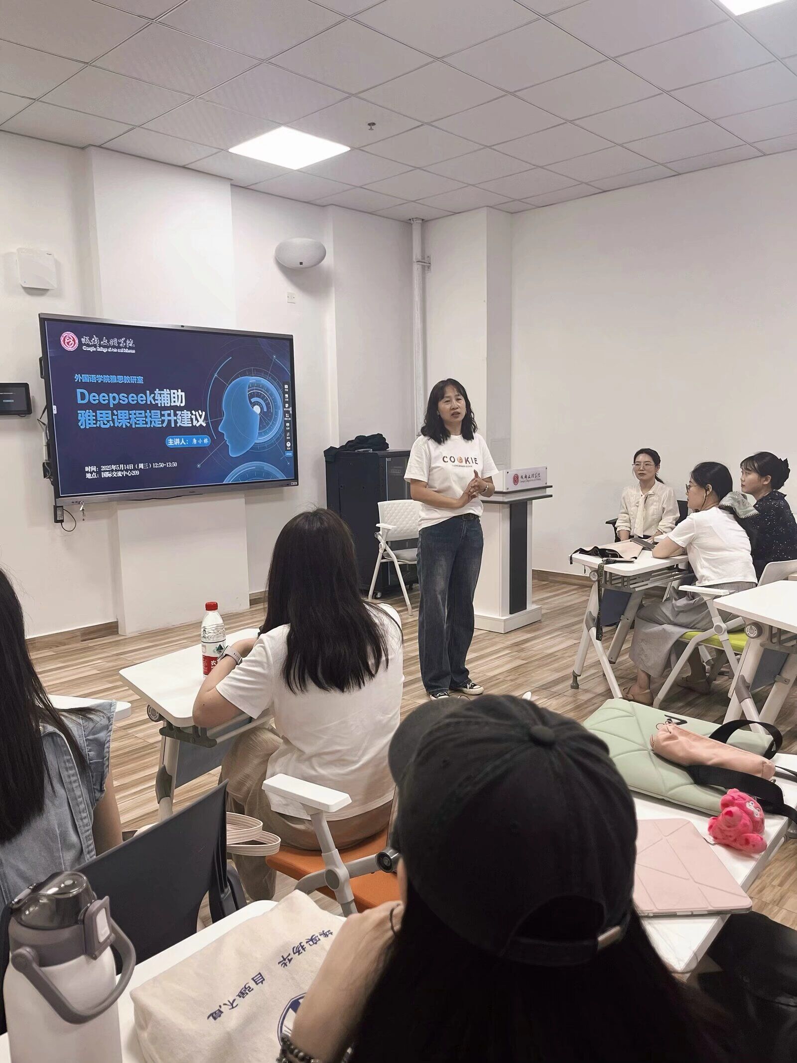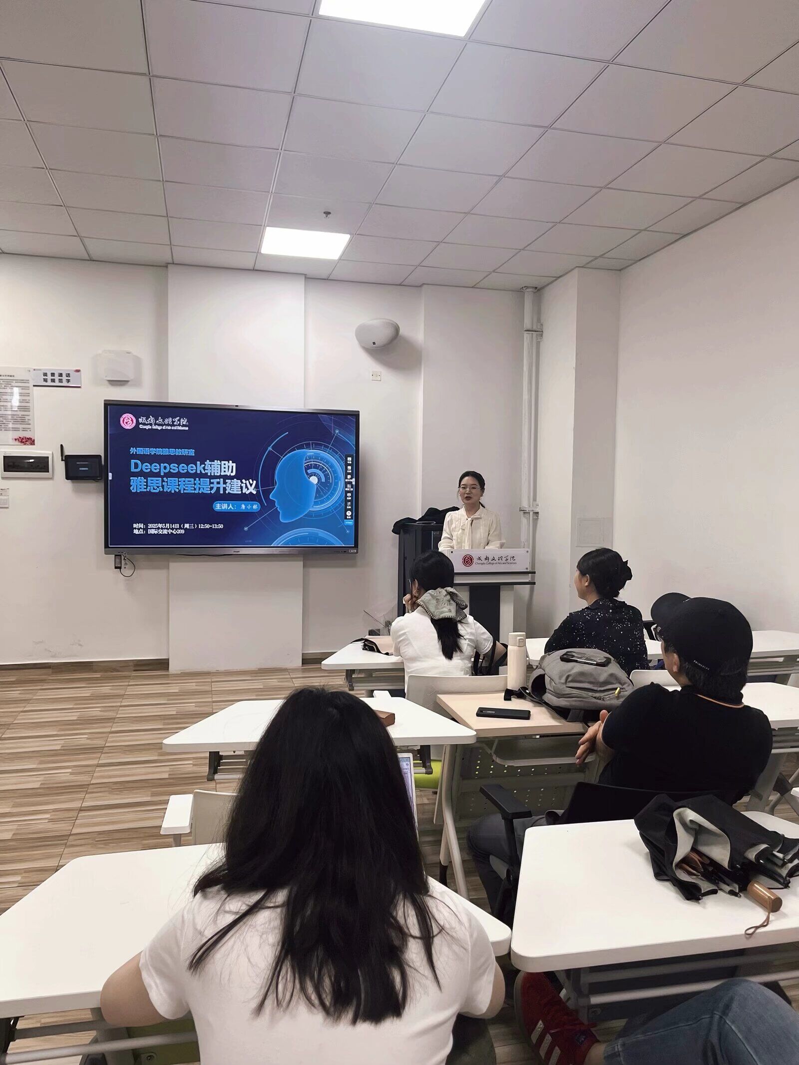 2025 年 5 月 14 日,mk体育雅思教研室在国际交流中心 209 举行了一场题为“Deepseek 辅助雅思课程提升”专题讲座此次讲座由雅思教研室主任张丽莺主持,唐小林老师主讲,教研室全体教师参会。