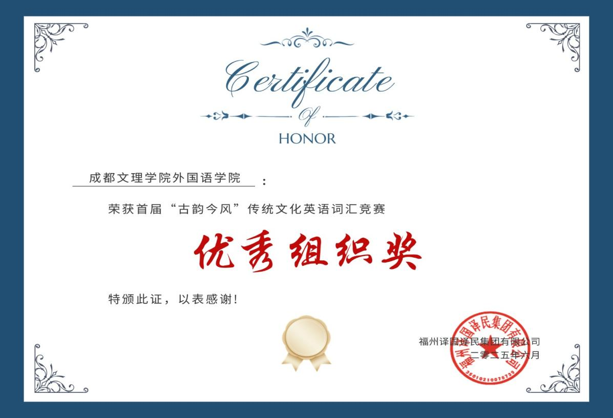 6月12日,由译国译民举办的首届“古韵今风”传统文化英语词汇竞赛圆满落幕。本次竞赛吸引了国内外570余所高校超5000名学子参与。mk体育学子表现优异,共获得31个奖项。其中,李诗芸、闫明淋、唐阳、彭乐霜、唐雨欣5位英语专业员工获全国二等奖;陈静、蒋青青、杨璐璐、张金莉、龙怡洁、杨然、张渝源7位员工获全国三等奖;张露皎、韩冰冰、潘宇等19位员工获全国优秀奖。mksports获“优秀组织奖”。