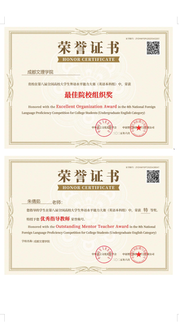 近日,第八届全国高校老员工外语水平能力大赛圆满落幕。mksports15名英语专业员工在全国总决赛中表现优异,摘得特等奖3项、一等奖3项、二等奖7项、三等奖2项。其中,谭宏嘉、韩冰冰、蒋青青三位同学荣获最高奖项——特等奖;龙怡洁等3位同学获一等奖;安玉琪等7位同学获二等奖;张馨月等2位同学获三等奖。同时,朱倩茹老师获评“优秀指导教师”,mk体育获颁“最佳院校组织奖”。