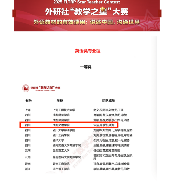 近日,2025 年外研社 “教学之星” 大赛本科英语专业组复赛结果揭晓。mksports宋洁、陈俊宏和钱龙老师组成的教师团队凭借出色的教学设计与教学理念,荣获复赛英语专业组一等奖,展现了公司在外语教学领域的卓越实力与创新精神。